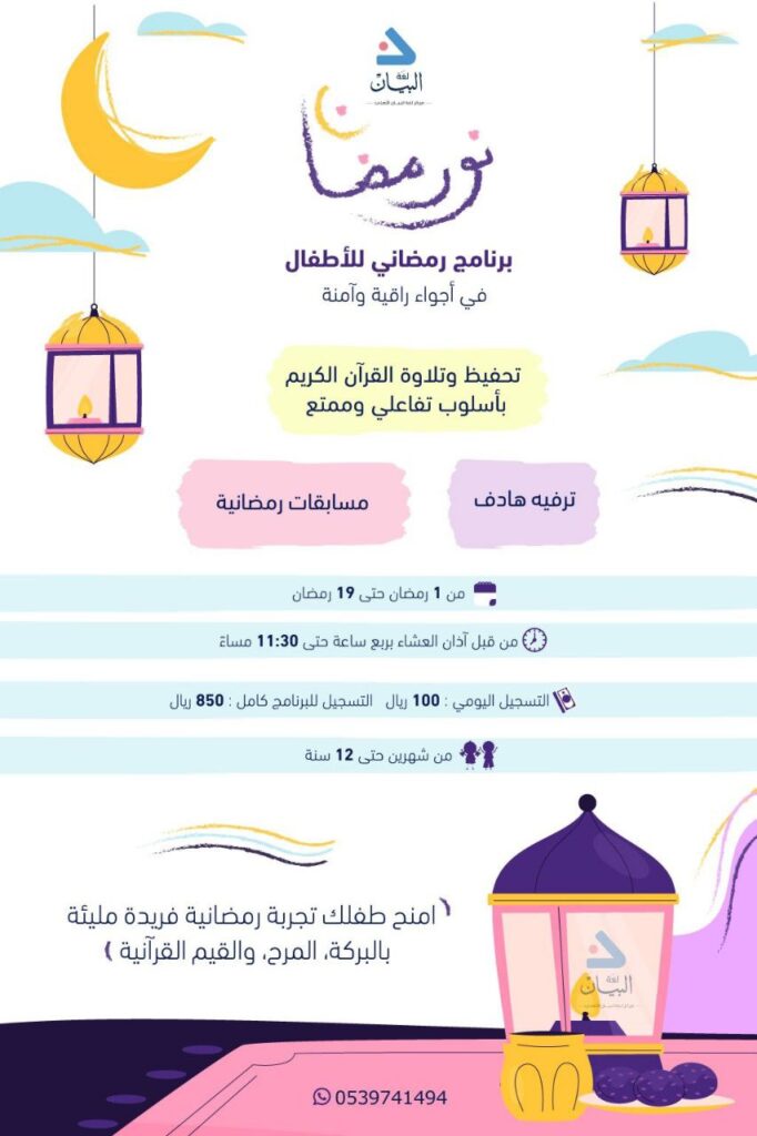✨ امنح أطفالك تجربة رمضانية فريدة مليئة بالبركة، المرح، والقيم القرآنية، في بيئة آمنة وراقية تحفزهم على التعلم والاستمتاع. 🌙