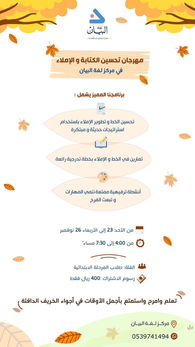 يسرّ مركز لغة البيان الأهلي أن يعلن عن إقامة مهرجان تحسين الكتابة والإملاء، وهو برنامج تدريبي متكامل يهدف إلى تطوير مهارات الخط والإملاء لدى طلاب المرحلة الابتدائية بأساليب حديثة وممتعة.